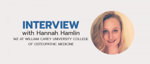 Hannah: I am a second-year student at William Carey University College of Osteopathic Medicine. It is one of the newer DO schools in the nation and is located in Hattiesburg, MS. I really enjoy going to a smaller school because it has allowed for our class to become very close. I strongly feel that having supportive friends makes the experience much more enjoyable. I am very glad I chose this school.
